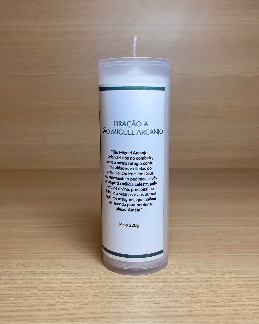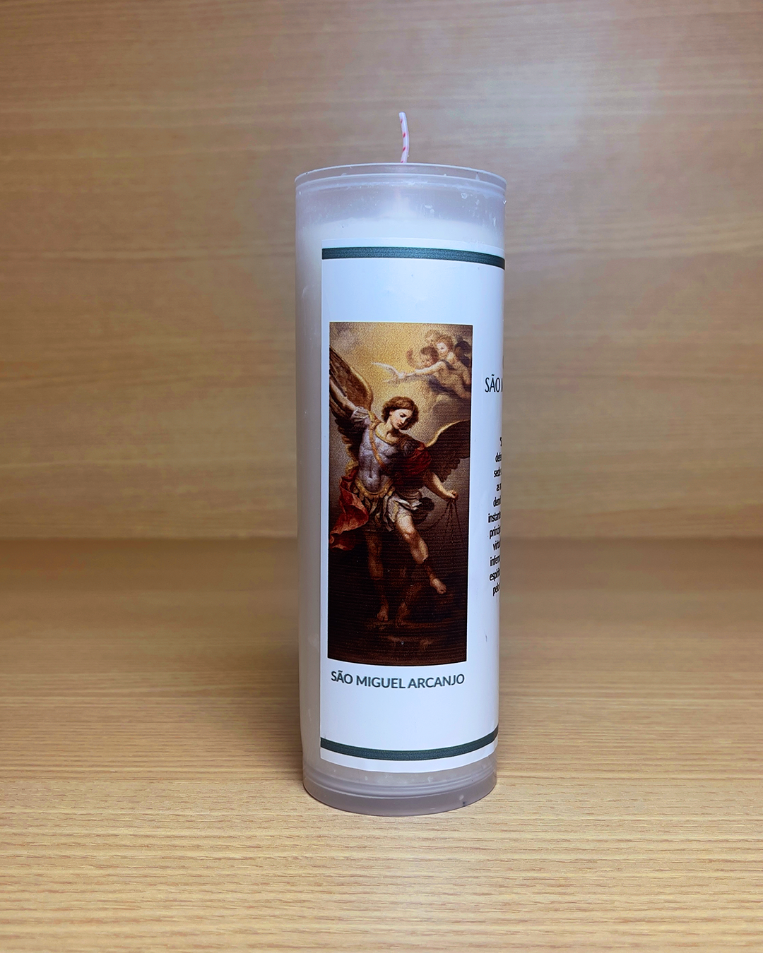Vela votiva de sétimo dia com a imagem de São Miguel Arcanjo, disponível na cor branca, com a embalagem em PVC.
