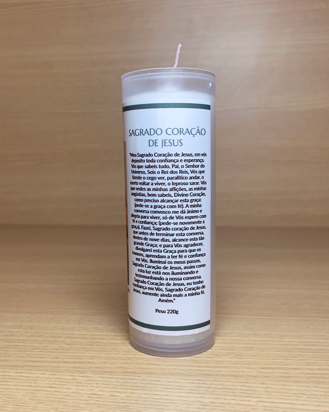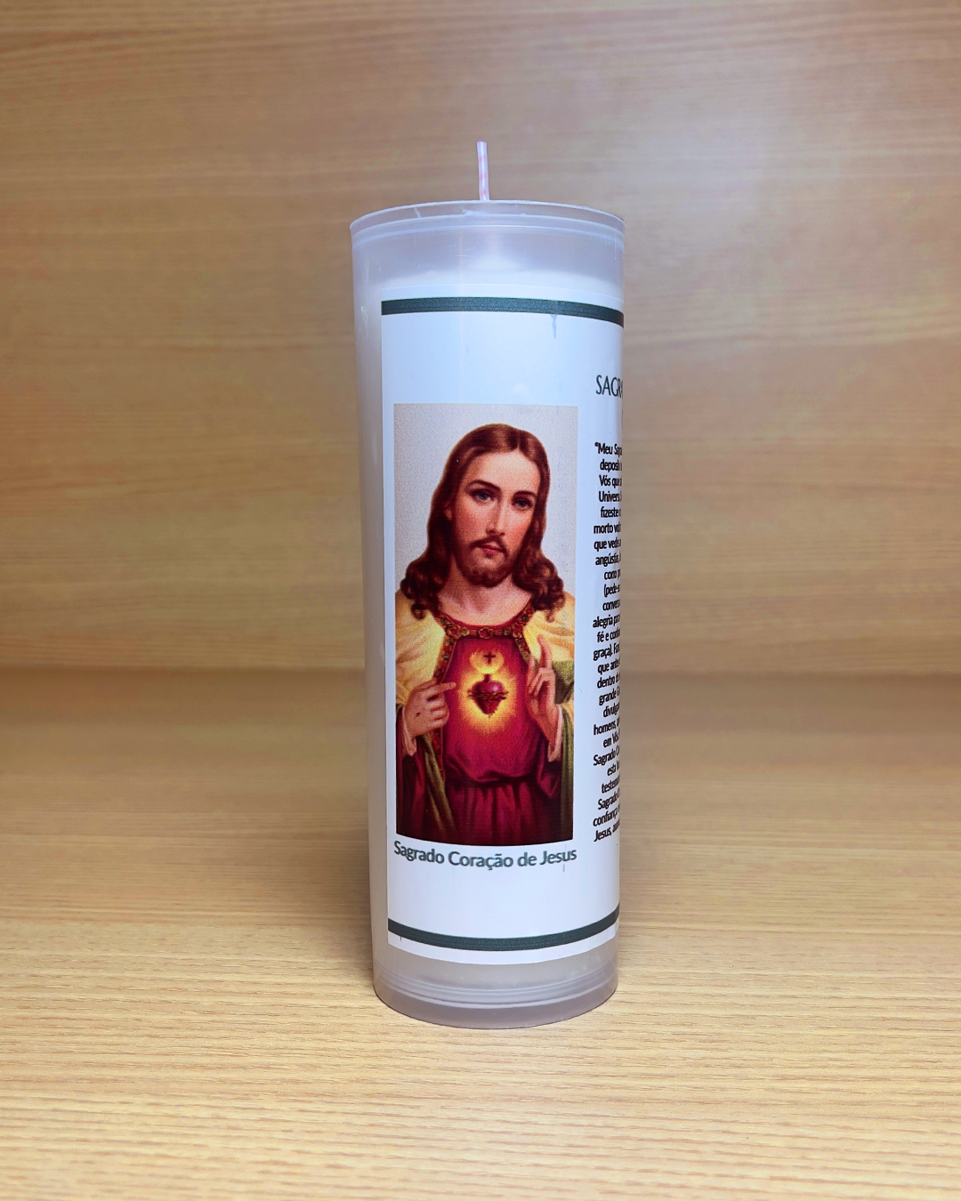 Vela votiva de 7 dias com a imagem do Sagrado Coração de Jesus, disponível na cor branca, com a embalagem em PVC.